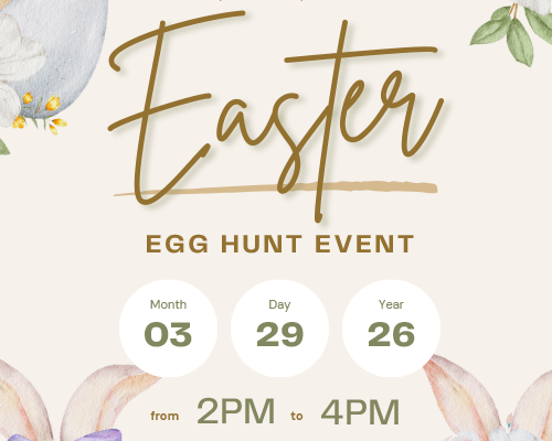 Each age group will have its own Easter egg hunt. There will be one “gold egg” or grand prize for each category. Prizes to TBD. There will be Easter bags with gift items for all children and bags can be used for the egg hunt.